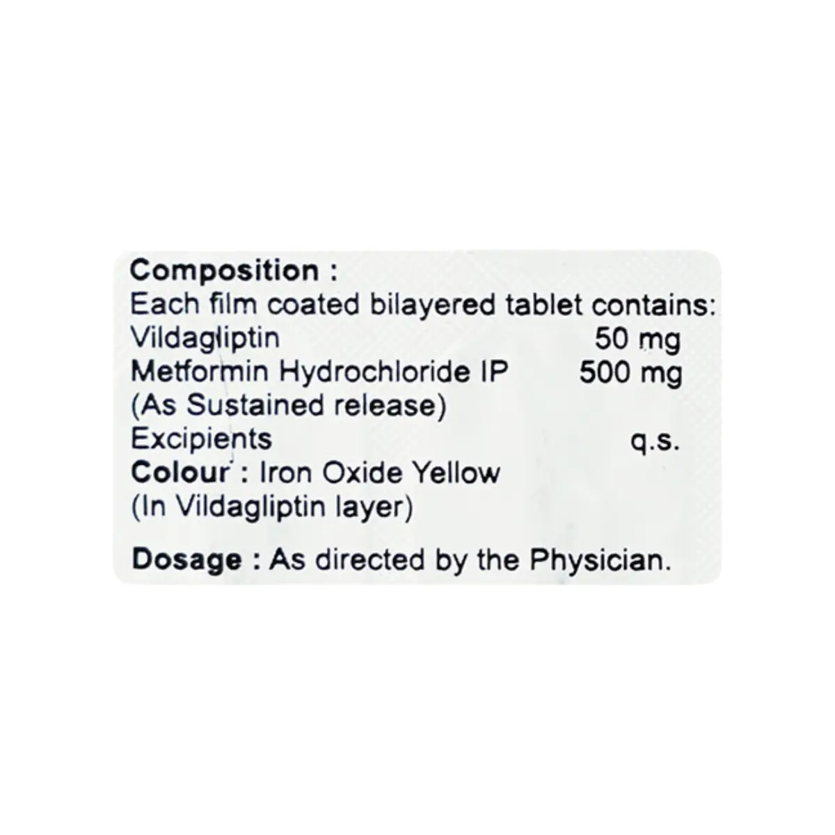 Vilatin M SR 50/500 Tablet is a therapeutic formulation that combines two active ingredients to effectively manage elevated blood glucose levels in individuals diagnosed with type 2 diabetes mellitus. The primary function of this medication is to help mitigate the risk of severe complications associated with diabetes, such as nephropathy and vision impairment, while also lowering the likelihood of cardiovascular incidents like heart attacks and strokes. This medication can be administered either as a standalone treatment or in conjunction with other antidiabetic agents. Optimal results are usually achieved when the medication is part of a comprehensive diabetes management plan, which includes adhering to a balanced diet and engaging in regular physical activity. The healthcare provider will determine the appropriate dosage based on individual health status, current blood sugar readings, and any other medications the patient may be taking. Taking Vilatin M SR 50/500 with meals may alleviate gastrointestinal discomfort. It is crucial for patients to maintain a consistent routine by taking the medication daily, as prescribed, and discontinuation should only be considered under medical guidance. Effective blood sugar regulation is vital for preventing long-term health issues, emphasizing the importance of following a lifestyle regimen recommended by healthcare professionals.