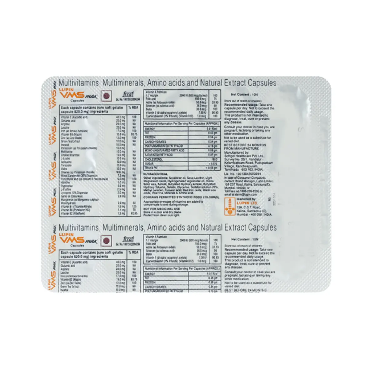 VMS MAX CAP is a dietary supplement designed to address nutritional deficiencies in the body. It is formulated to enhance overall health and vitality, supporting various physiological functions. The components of this supplement are particularly beneficial for the welfare of joints and muscles, contributing to mobility and physical activity. By supplying essential vitamins and minerals, VMS MAX CAP helps maintain heart health and aids in the proper functioning of various bodily systems. This supplement can be especially useful for individuals feeling fatigue, as it may help enhance energy levels and stimulate appetite. Additionally, the presence of powerful antioxidants, such as vitamin E, is intended to protect the body from the damaging effects of free radicals, thereby supporting cellular health. Furthermore, the anti-inflammatory properties of this formulation may assist in reducing inflammation within the body, promoting better joint function and comfort. Overall, VMS MAX CAP serves as a comprehensive dietary aid to help meet the nutritional requirements necessary for optimal health. Use this medicine only under medical supervision. Follow the dose and schedule exactly as advised. Do not stop abruptly without guidance. Keep a record of any unusual symptoms and share them with your clinician. Combine therapy with appropriate lifestyle measures and routine monitoring as recommended.