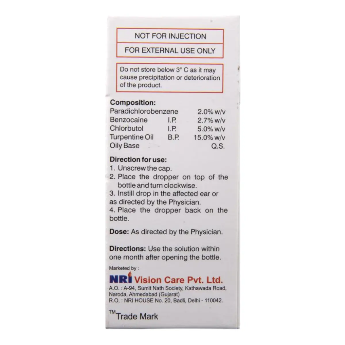 WAX OFF ADVANCE (Benzocaine (2.7% w/v) + Chlorbutol (5.0% w/v) + Paradichlorobenzene (2.0% w/v) + Turpentine Oil (15.0% w/v))
