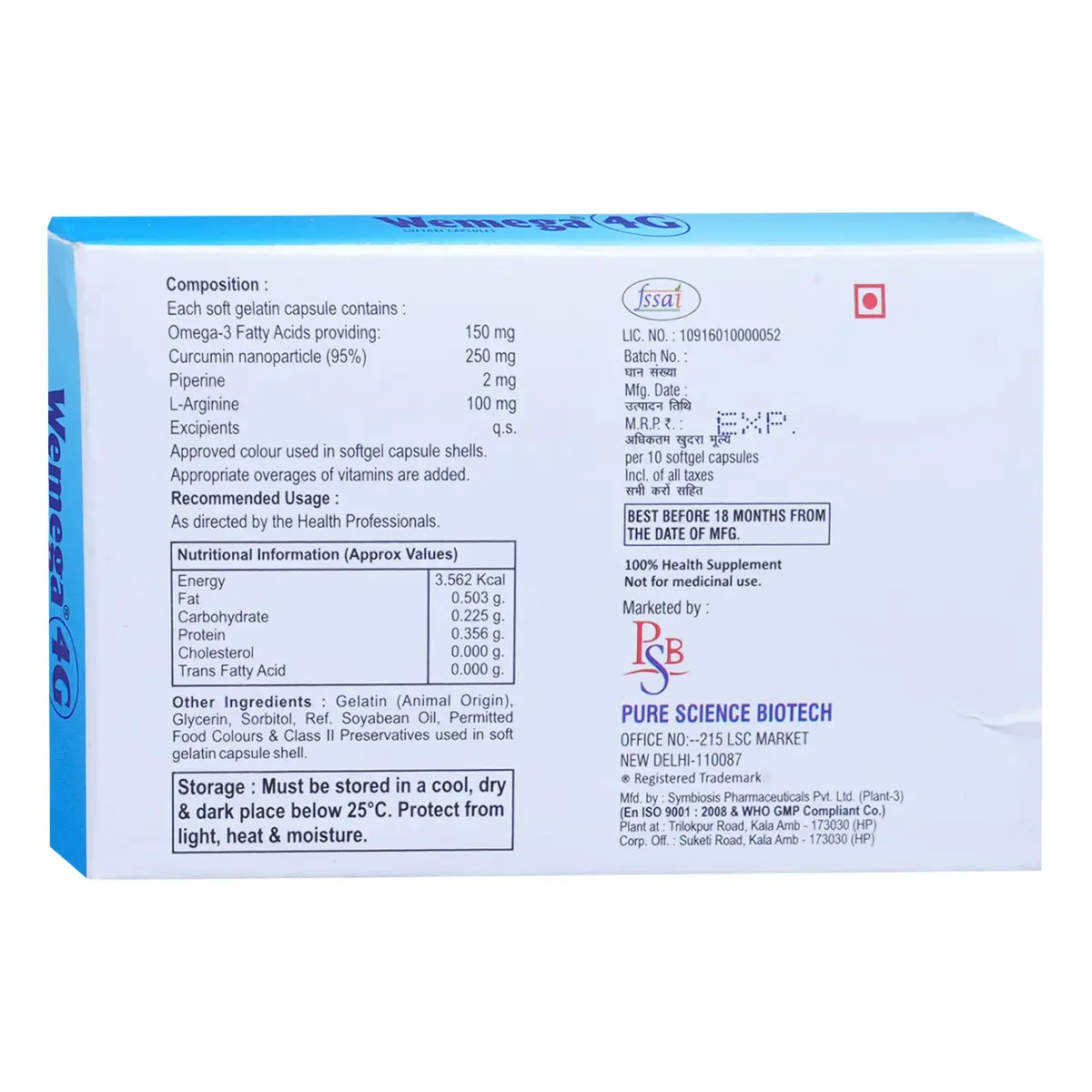 Wemega 4G Capsule is designed to support individuals dealing with arthritis and bone-related deficiencies. This formulation is rich in properties that combat tumors, reduce inflammation, and provide antioxidant benefits, contributing to overall immune function. Furthermore, it plays a significant role in enhancing the nervous system and ensuring proper blood flow throughout the body. The capsules facilitate the digestive process by promoting the efficient absorption of essential nutrients. One of the key components, curcumin, is known for its positive effects on heart health and cognitive function. It is commonly utilized for alleviating joint discomfort and managing inflammation due to its notable anti-inflammatory characteristics. The product is advantageous in enhancing immune responses and ensuring effective blood circulation. It also serves to boost cognitive performance, aiding memory retention and supporting overall brain health. Additionally, the formulation is beneficial for digestive efficiency, accelerating nutrient uptake and promoting a healthy digestive tract. Curcumin within the capsules further supports both digestive health and cognitive function. This product is particularly recognized for its potential to enhance metabolic processes and aid in weight management. It is also noted for its effectiveness in diminishing joint discomfort and inflammation, while embodying significant anti-inflammatory and antioxidant qualities. The formulation may also play a role in reducing the likelihood of heart-related diseases and improving cardiovascular wellness.