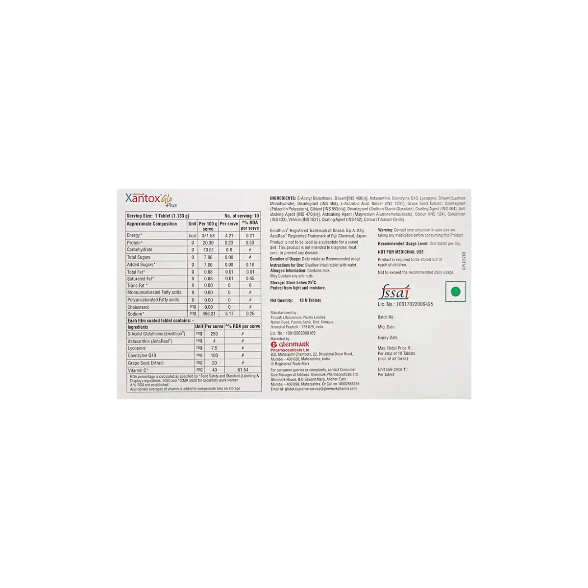 XANTOX GLO PLUS (S-Acetyl Glutathione: 250 mg Astaxanthin (AstaReal): 4 mg Lycopene: 7.5 mg Coenzyme Q10: 100 mg Grape Seed Extract: 20 mg Vitamin C: 40 mg)