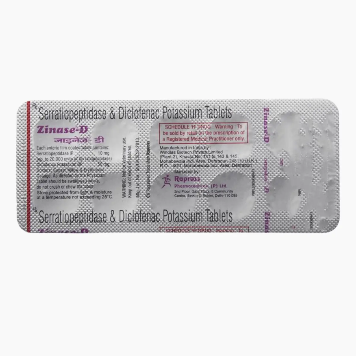 Zinase-D Tablet consists of a combination of two active substances and is indicated for alleviating pain and inflammation associated with conditions such as rheumatoid arthritis, ankylosing spondylitis, and osteoarthritis. This medication is also effective for managing muscle discomfort, back pain, toothaches, or pain in the ear and throat. Patients may take Zinase-D Tablet regardless of meals, but the dosing regimen should be tailored to the specific condition being treated and the individual’s response to the medication. Adherence to the prescribing physician’s recommendations is essential, and patients should not exceed the advised dosage or duration of use. Commonly reported adverse reactions include nausea, vomiting, heartburn, abdominal pain, indigestion, diarrhea, and decreased appetite. Should any of these reactions become troubling or worsen, it is advisable to consult a healthcare professional, who may provide strategies for mitigating these effects. Prior to commencing treatment, it is vital for individuals to disclose any history of stomach ulcers or gastrointestinal bleeding, hypertension, or existing heart, kidney, or liver issues. All concurrent medications must also be communicated to the doctor, as they could interact with Zinase-D Tablet. It’s essential for pregnant or breastfeeding women to seek medical advice before beginning treatment. Alcohol consumption should be avoided during the course of this medication due to the potential for increased sedation.